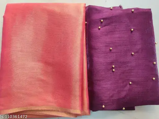 The solid purple base is beautifully adorned with beads and stones work, making it perfect for parties, festive occasions, and special events. It comes with a matching Bangalori silk separate blouse piece, featuring embellished work that complements the saree and allows for a customized fit.
